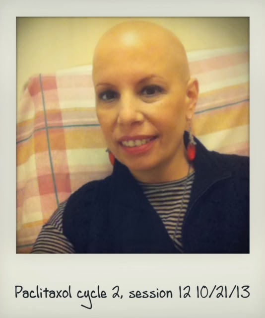 On Columbus Day I went for my 11th chemo cocktail and then for my cat scan of the chest with contrast. Talk about feeling toxic. I shouldn't have been allowed to walk the streets without a hazmat suit. The following day Dr. Dana was the first of three doctors to break the news that I'm still improving! The number of tumors has not changed but the tumors are continuing to shrink, which is exactly what we are striving for. Later on I spoke with my oncologist, Dr. B, who was very pleased with the results. He explained to me that because (i) I am tolerating the chemo so well (ii) I have not reached a point of toxicity (iii) I have not yet reached the best results, it behooves me to start another three month cycle of the paclitaxel. Yesterday I had the last of my cycle two cocktails. Next week I will take a breather and on Monday, November 4, I will being cycle three.